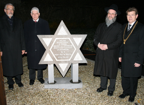Erinnerung an Pogrom vor 72 Jahren: Regierungspräsident Dr. Paul Beinhofer, Dr. Josef Schuster, Rabbiner Jakov Ebert und Oberbürgermeister Georg Rosenthal am Platz der ehemaligen Synagoge in der Domerschulstraße. Foto: Georg Wagenbrenner |