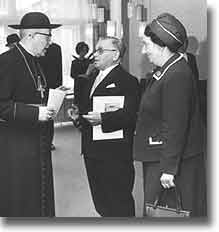 Senator David Schuster während der Einweihung der Synagoge 1970 mit seiner Frau Anita und Bischof Dr. Josef Stangl ...