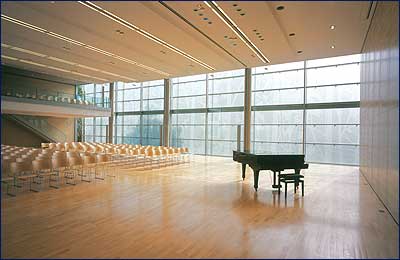 Vor dem Jüdischen Gemeindezentrum weitet sich der Gehsteig zu einem Vorplatz, der anregt die Schritte zu verlangsamen. Die einladende Passage zeigt den Eingang zu den Gemeinderäumen, zum Museum und zum jüdischen Dokumentationszentrum und läßt den schönen Innenhof mit den schon beschriebenen Bereichen spüren. Besucher, Gäste, die Gemeinde sammeln sich im Hof. Sie stehen hier zugleich über dem ausgewiesenen Fundament der Würzburger Judengemeinde, den sorgfältig archivierten und dort gelagerten mittelalterlichen Grabfsteinfunden. Das Leben der jüdischen Gemeinde, die täglichen Begegnungen, die Ruhe des Schabbat, die Freude an großen Festen wird durch diese Gebäudeordnung gefördert. Das Museum ist zur Straße optisch geschlossen, doch vom Innenbereich überall einsehbar. Erdgeschoß und Untergeschoß sind durch hohe Lichträume zu einer Einheit verschmolzen und die freistehende Treppe in atmosphärischer Raumdichte erlebbar. Jüdisches Leben ist mittels Texten, Fotografien, herausgehobenen ausgestellten mittelalterlichen Grabsteinfragmenten, themenbezogenen Objekten, sowie Bild- und Filmsequenzen sorgfältig ins Licht gesetzt. Darüber befinden sich die Festräume der Gemeinde, durch das offenen Foyer fließend miteinander verbunden. Der Festsaal, transparent, aber nicht nach außen offen, mehrfach teilbar, mit eingestellter Empore ist auch synagogal nutzbar. Auf der anderen Seite ist der Zugang zur Synagoge. Die verbindende Brücke läßt sich am Laubhüttenfest als Sukkah zum Himmel öffnen und führt über eine weitere Foyerzone zur Synagoge. Der Speisesaal wird durch die zentral gelegene Koschere Küche versorgt. Die innere Struktur des Gebäudes ist von außen ablesbar. Der Charakter der eingesetzten Materialien prägt den Bau: Naturstein in Verbindung mit Glas, Stahl, Aluminium in den Fassaden zur Straße, Putzflächen zum Hof, weiße Wand- und Deckenflächen, Naturstein, helles Ahornparkett, einfarbiges Linoleum am Boden. Dazu die Holzoberflächen der Wandverkleidungen im Saal und Foyer, ebenso der Türen und Fensterbänke. Die Möblierung wurde sorgfältig auf die einzelnen Raumbereiche abgestimmt. |