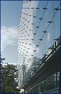 Die Baukörper des Jüdischen Gemeindezentrums mit ihren unterschiedlichen Nutzungen gruppieren sich um einen in sich ruhenden, zu Kommunikation einladenden Innenhof. Die Zugänge zur Synagoge, zur Verwaltung, den Gemeinderäumen, dem Museum sind klar definiert. Der Besucher freut sich über die Einblicke. Im Nordosten öffnet sich das neu gestaltete Foyer der bereits 1970 eingeweihten Synagoge, die als geistliches Zentrum mit ihrer Kuppel von überall sichtbar bleibt. Der Lärm der Bahnlinie im Südosten wird mittels eines langgestreckten geschlossenen Baukörpers abgeschirmt. Die in diesem Flügel untergebrachten Gemeinde- und Seminarräume sind zum Innenhof orientiert. Die vor den Räumen gepflanzte Baumreihe gibt ihnen ihre Individualität. Analog orientieren sich auch die Räume des Westflügels. Man erhält einen Einblick in die Welt des Museums und in das darüber liegende Gemeindefoyer. Die Jugend- und Übernachtungsräume in den Obergeschossen profitieren ebenso wie der rückwärts angeordnete Altenclub und die Hausmeisterwohnung von dem geschützten Bereich. Der Kopfbau an der Valentin-Becker-Straße zeigt das Gemeindezentrum im städtischen Raum, gibt ihm durch seine Gestaltung, die Verwendung von Schönbrunner Sandstein, der entfernt an die Tempelmauer in Jerusalem erinnert, und durch die dem David-Schuster-Saal vorgelagerte künstlerisch gestaltete Glasfront einen eigenen Akzent. Das kunstvoll gestaltete Glasbild schützt vor allzu genauer Einsicht, vor Lärm und zusammen mit der integrierten Lamellenanlage vor starkem Sonnenlicht. Erreicht ist Transparenz und Offenheit auch nach außen. |