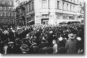 | Mit dem Ende des 1. Weltkrieges und der Monarchien in Deutschland änderte sich auch für die Würzburger Juden das politische und gesellschaftliche Umfeld. Trotz sich bereits zu Beginn der zwanziger Jahre abzeichnender antisemitischer Agitationen konnten sich in Würzburg und anderen unterfränkischen Städten Juden bis zum Beginn der dreißiger Jahre als voll integriert betrachten. Im Handel und in der Industrie erlangten jüdische Firmen große Rollen. Der Anteil von Juden unter den beruflich Selbstständigen war überproportional, beispielsweise bei den in Würzburg niedergelassenen Ärzten und Rechtsanwälten. |