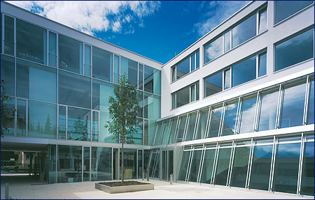 Die Baukörper des Jüdischen Gemeindezentrums mit ihren unterschiedlichen Nutzungen gruppieren sich um einen in sich ruhenden, zu Kommunikation einladenden Innenhof. Die Zugänge zur Synagoge, zur Verwaltung, den Gemeinderäumen, dem Museum sind klar definiert. Der Besucher freut sich über die Einblicke. Im Nordosten öffnet sich das neu gestaltete Foyer der bereits 1970 eingeweihten Synagoge, die als geistliches Zentrum mit ihrer Kuppel von überall sichtbar bleibt. Der Lärm der Bahnlinie im Südosten wird mittels eines langgestreckten geschlossenen Baukörpers abgeschirmt. Die in diesem Flügel untergebrachten Gemeinde- und Seminarräume sind zum Innenhof orientiert. Die vor den Räumen gepflanzte Baumreihe gibt ihnen ihre Individualität. Analog orientieren sich auch die Räume des Westflügels. Man erhält einen Einblick in die Welt des Museums und in das darüber liegende Gemeindefoyer. Die Jugend- und Übernachtungsräume in den Obergeschossen profitieren ebenso wie der rückwärts angeordnete Altenclub und die Hausmeisterwohnung von dem geschützten Bereich. Der Kopfbau an der Valentin-Becker-Straße zeigt das Gemeindezentrum im städtischen Raum, gibt ihm durch seine Gestaltung, die Verwendung von Schönbrunner Sandstein, der entfernt an die Tempelmauer in Jerusalem erinnert, und durch die dem David-Schuster-Saal vorgelagerte künstlerisch gestaltete Glasfront einen eigenen Akzent. Das kunstvoll gestaltete Glasbild schützt vor allzu genauer Einsicht, vor Lärm und zusammen mit der integrierten Lamellenanlage vor starkem Sonnenlicht. Erreicht ist Transparenz und Offenheit auch nach außen. |