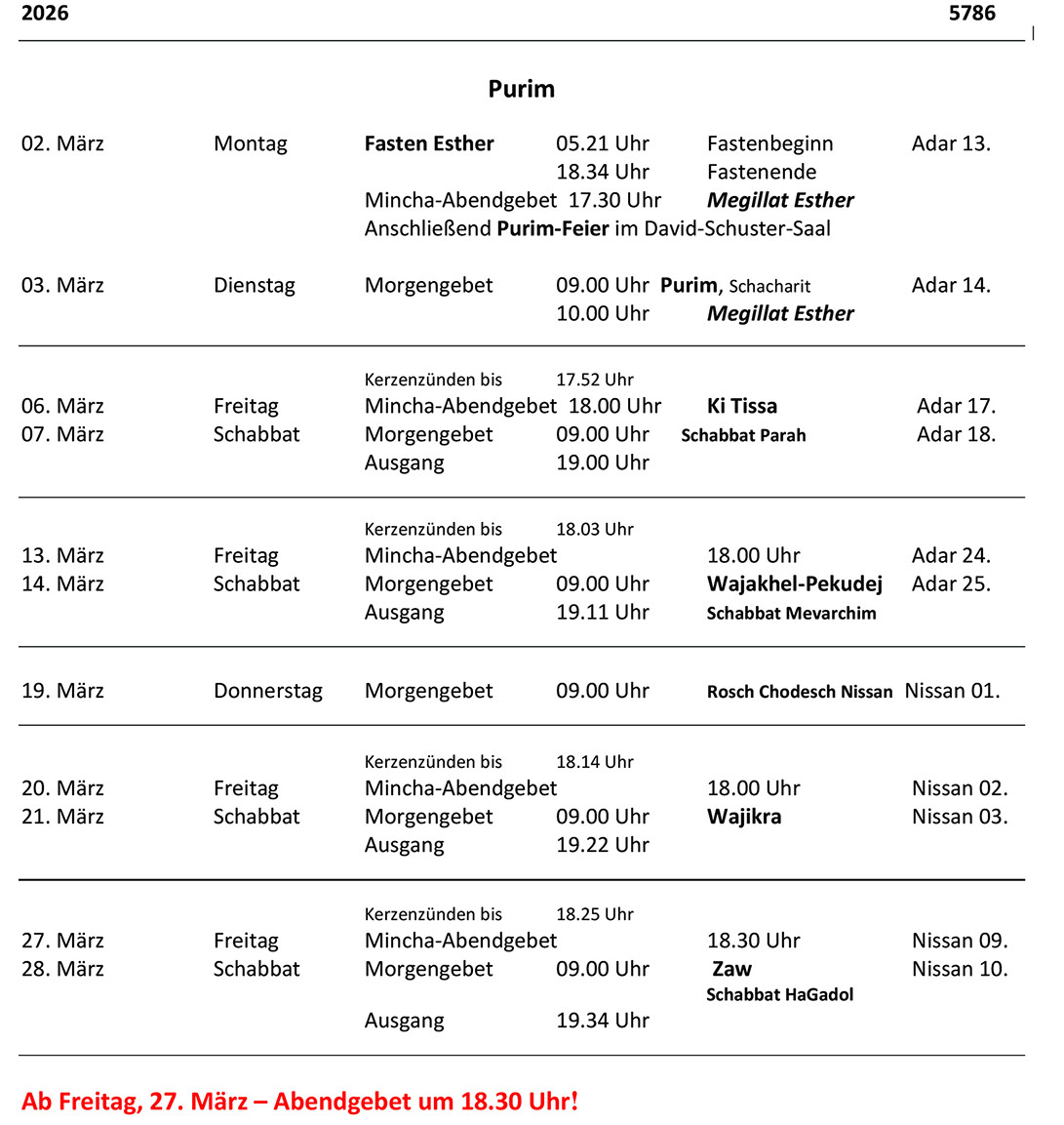 Gebetszeiten März 2026 – Adar / Nissan 5786